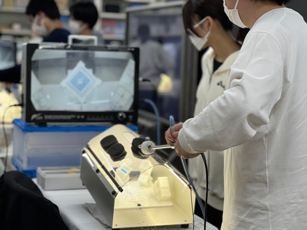 研修当日は、全国から集まった学生同士が2人1組となり、動静脈血管モデルを用いた穿刺演習、清潔ガウン・手袋の着脱、内視鏡用ビデオスコープの操作など、多岐にわたる実技演習に取り組まれました。